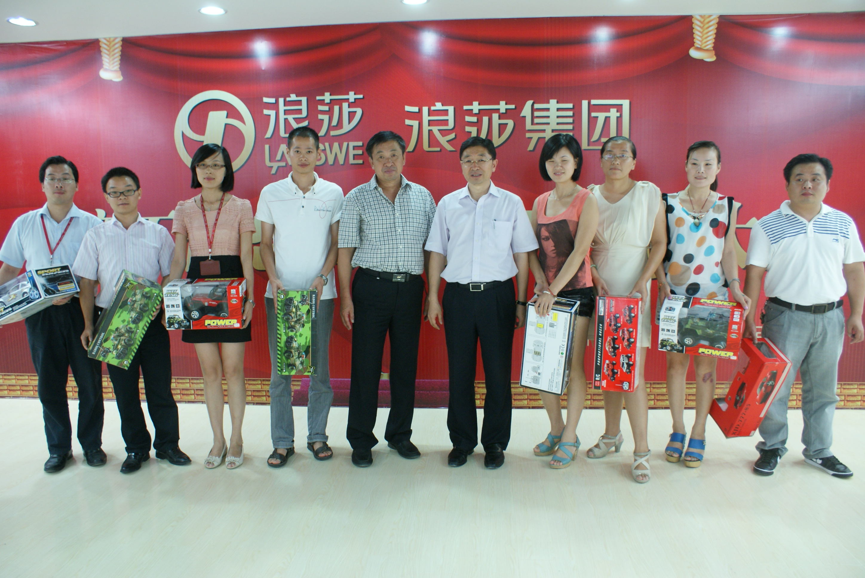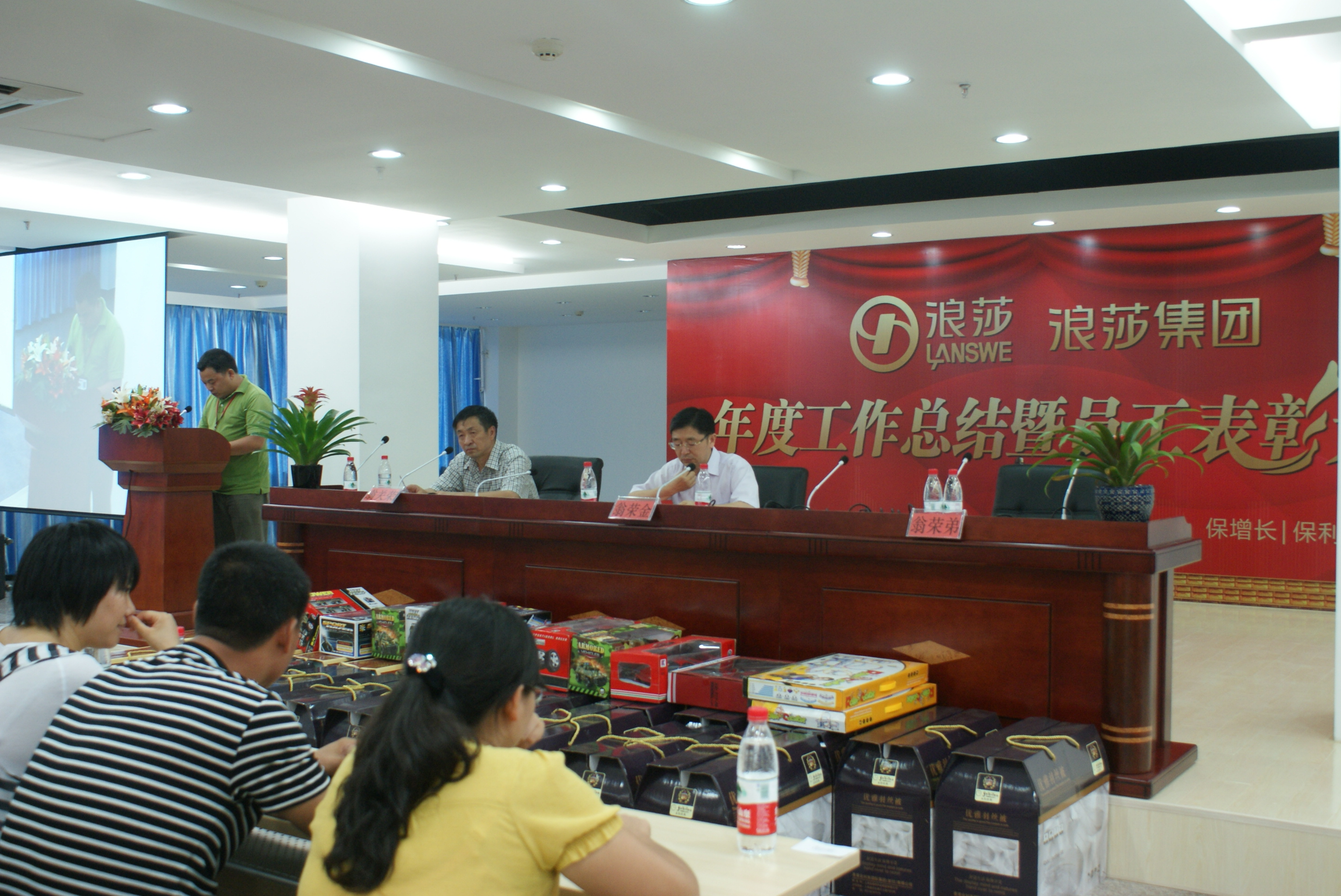8月18日下午,浪莎集團年度工作總結暨員工表彰大會在三期內衣樓6樓圓滿舉行,集團總經理翁關榮、董事長翁榮金、總裁翁榮弟出席了本次大會。參加大會的主要人員有各部長、經理、正副主任、大辦公室所有人員等,各車間優秀模范代表也參加了本次大會,總計四五百人,大會由總經辦主任江學波主持。
